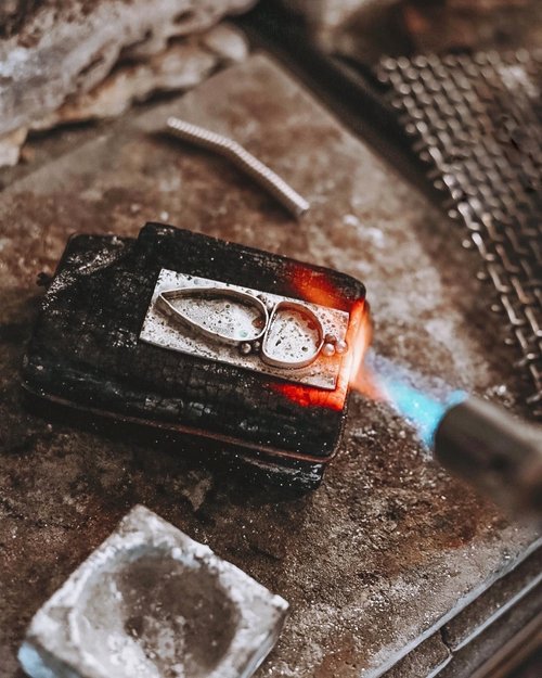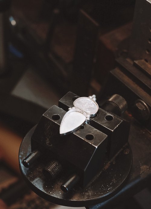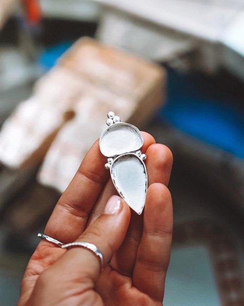 The design is then cut out of a silver silver sheet, and then form them into bezels that will hold the stones securely.The stones are then placed inside the bezels and the metal is folded around the stone. The stone is then placed under a hand dremel to be polished to perfection and ready for selling.